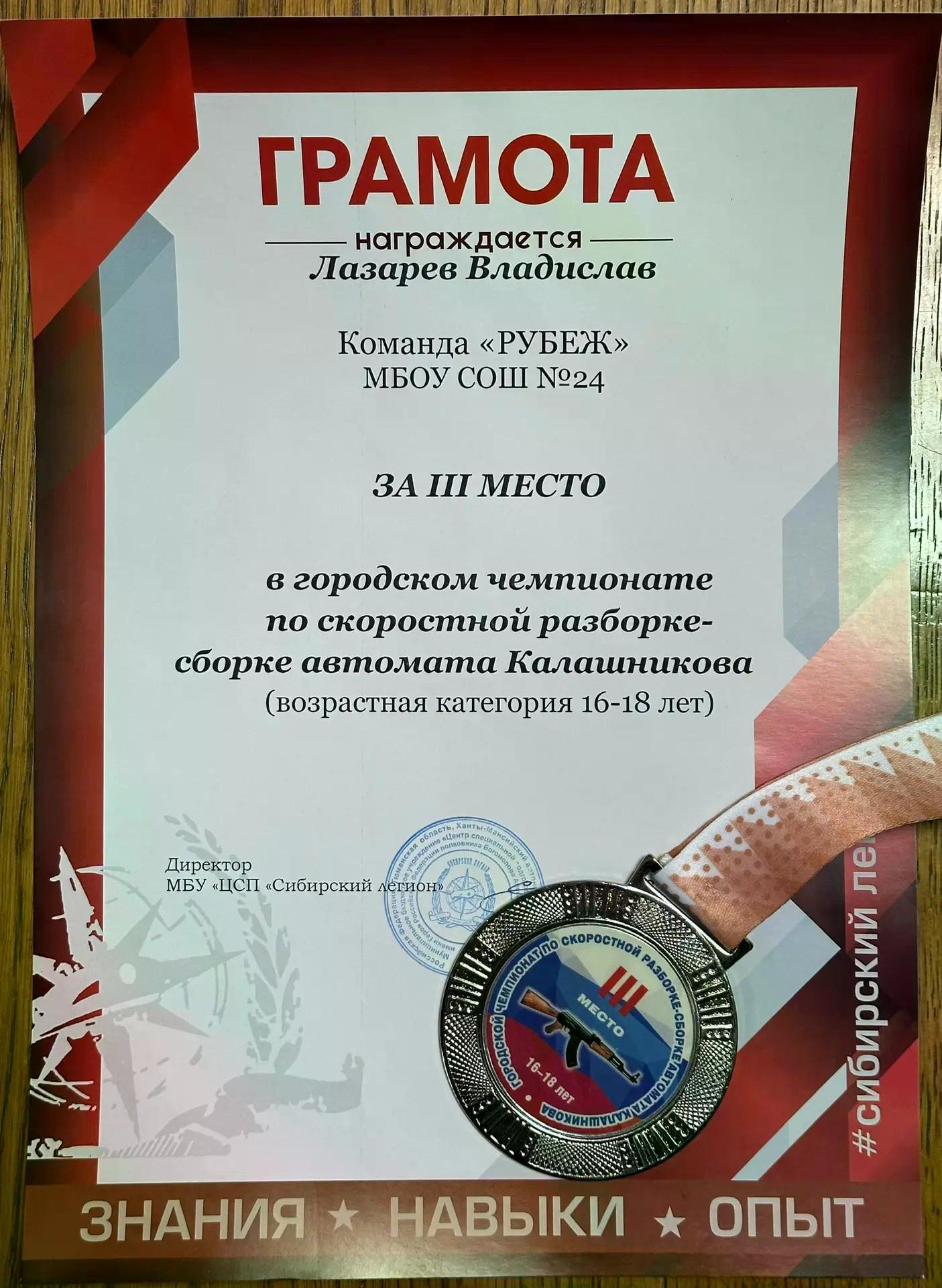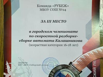 Поздравляем Лазарева Владислава, ученика 11 класса, занявшего 3 место в личном зачете в возрастной категории 16-18 лет и Марченко Илью Игоревича, учителя ОБЗР, занявшего 3 место в личном зачете в возрастной категории 19-35 лет. Победители получили приглашение к участию в I-ой городской Лиге Чемпионов по скоростной разборке-сборке автомата Калашникова «АК-РЕКОРД 2025/26» в мае 2026 года.