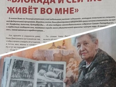 Сейчас Нина Дмитриевна по состоянию здоровья мало выходит из дома, а раньше она вела работу в Сургутском клубе жителей блокадного Ленинграда, много общалась со школьниками и очень скучала по родному городу. Принимала активное участие в городских выставках и занимала с мужем призовые места. У нее есть сын и дочь, уже 3 внука. Пожелаем Нине Дмитриевне крепко здоровья, на таких людях держится наша страна!»