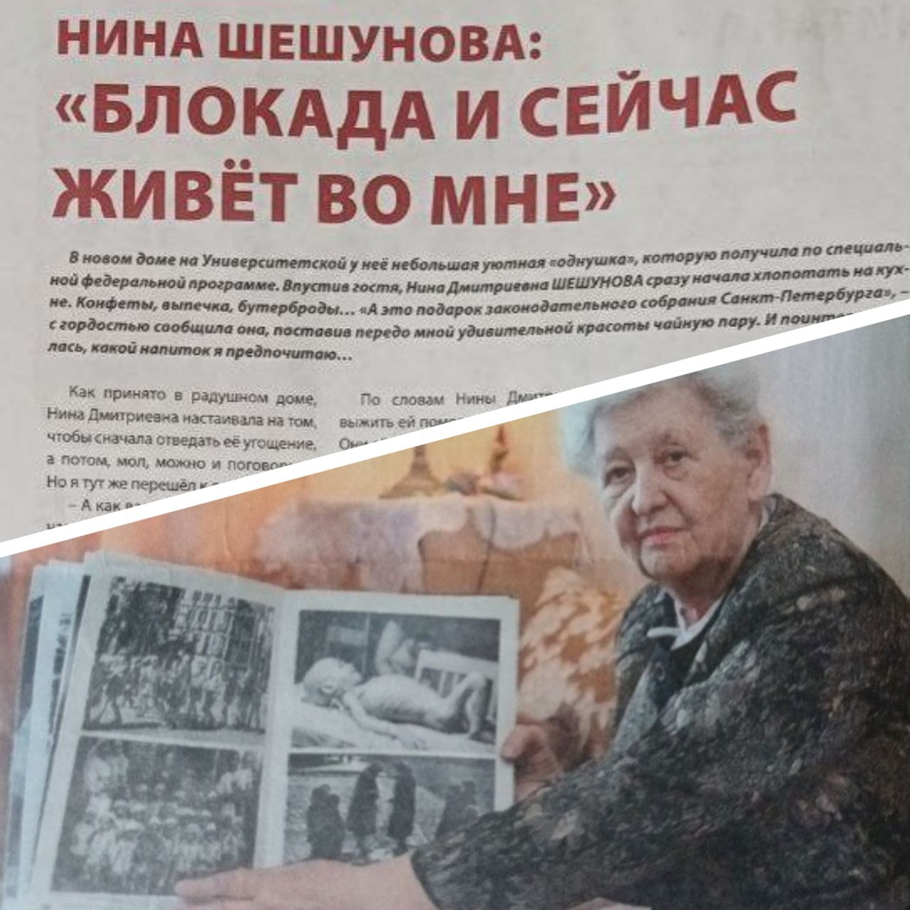 Нина Дмитриевна испытала все ужасы блокадного Ленинграда на себе. На вопрос «Часто ли вы вспоминает «то время»? Нина Дмитриевна ответила: «А мы его никогда не забывали! Просто его невозможно забыть! Можно отвлечься и думать совершенно о других вещах, но все равно блокада постоянно…. живет в нас» Маленькая Нина совсем не могла ходить от голода и холода – все время лежала. Ели все, что можно было, помнит она лепешки на солидоле. Игрушек не было. Выжить ей помогла гороховая каша. Они называли ее «шупаша» Это было в 1944 году, когда сняли блокаду, и Ниночка начала передвигаться ножками и пошла в детский садик. Но до 25 лет она не могла не только ощущать запах гороха, но даже слышать это слово!