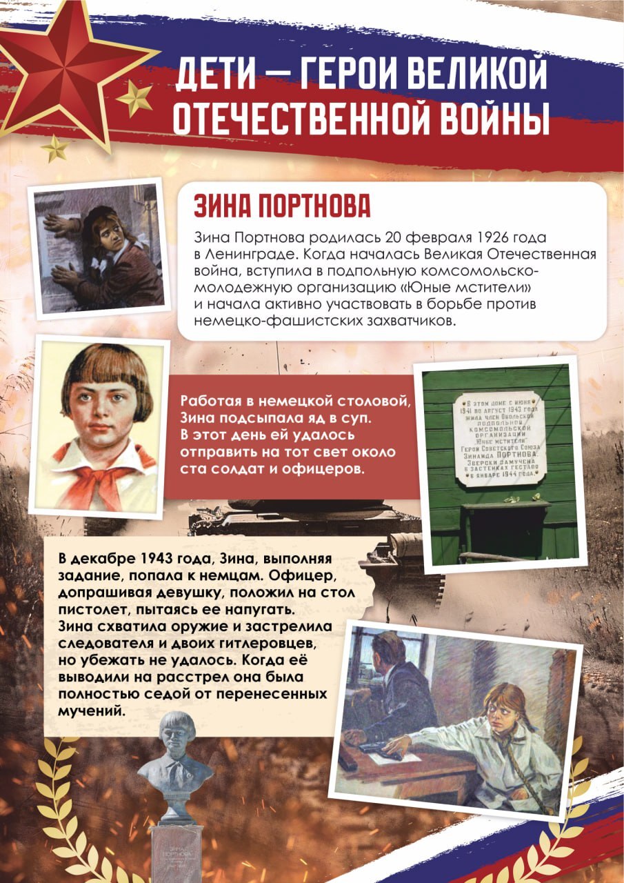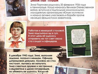 Зина Портнова родилась 20 февраля 1926 года в Ленинграде. Когда началась Великая Отечественная война, вступила в подпольную комсомольско-молодежную организацию «Юные мстители» и начала активно участвовать в борьбе против немецко-фашистских захватчиков.