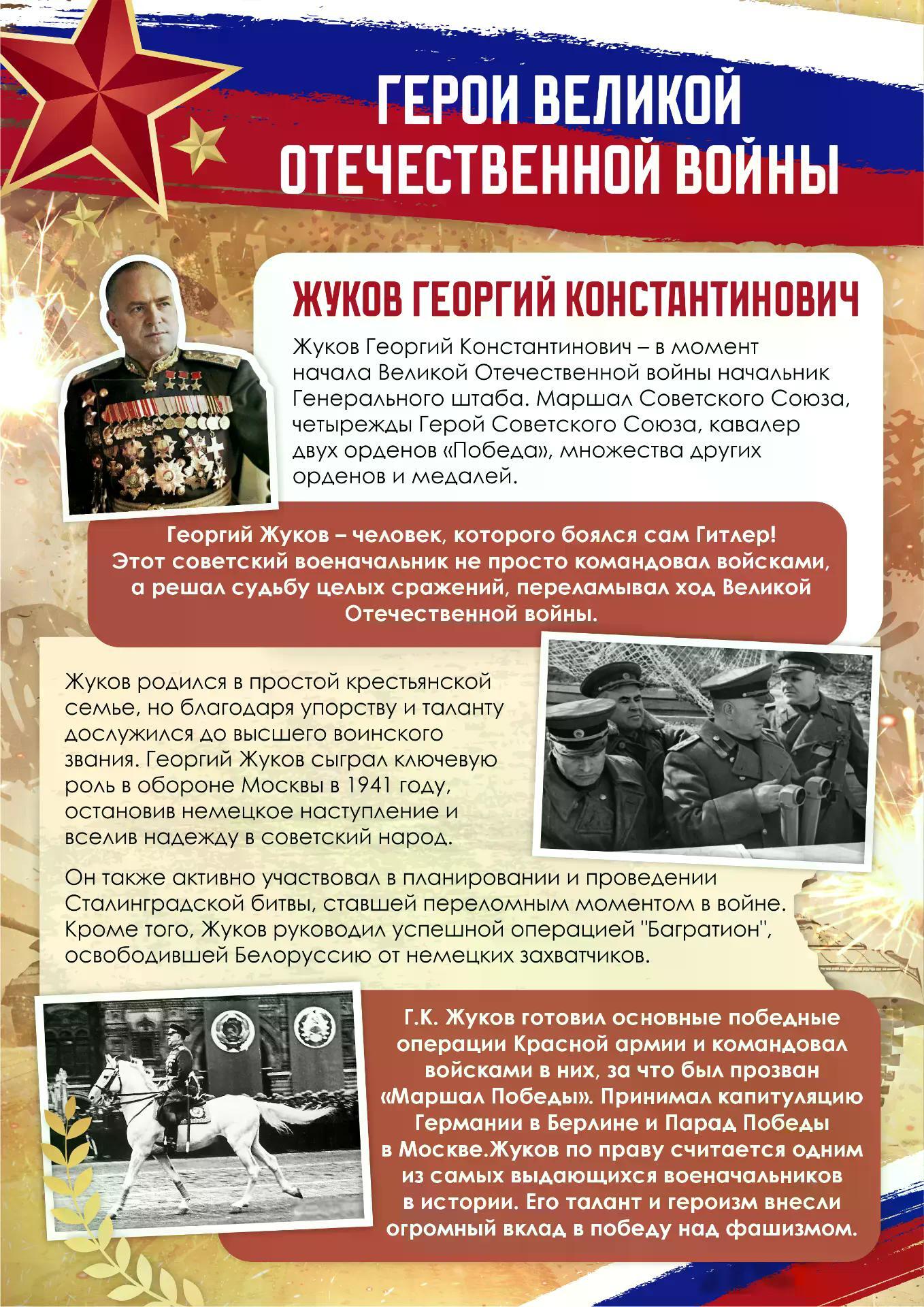 Жуков родился в простой крестьянской семье, но благодаря упорству и таланту дослужился до высшего воинского звания. Георгий Жуков сыграл ключевую роль в обороне Москвы в 1941 году, остановив немецкое наступление и вселив надежду в советский народ.